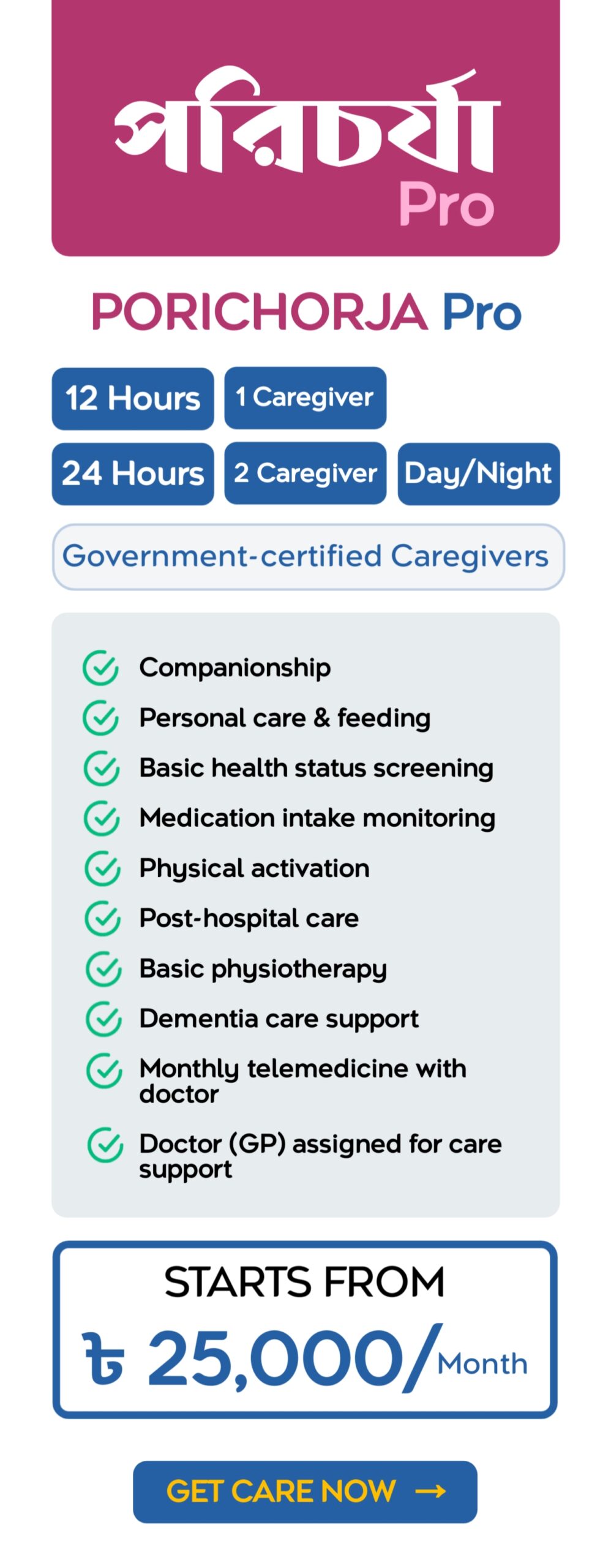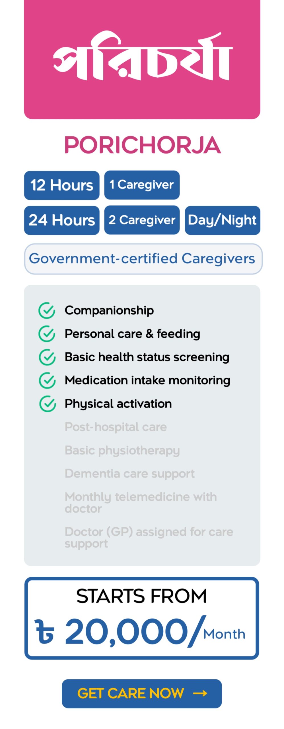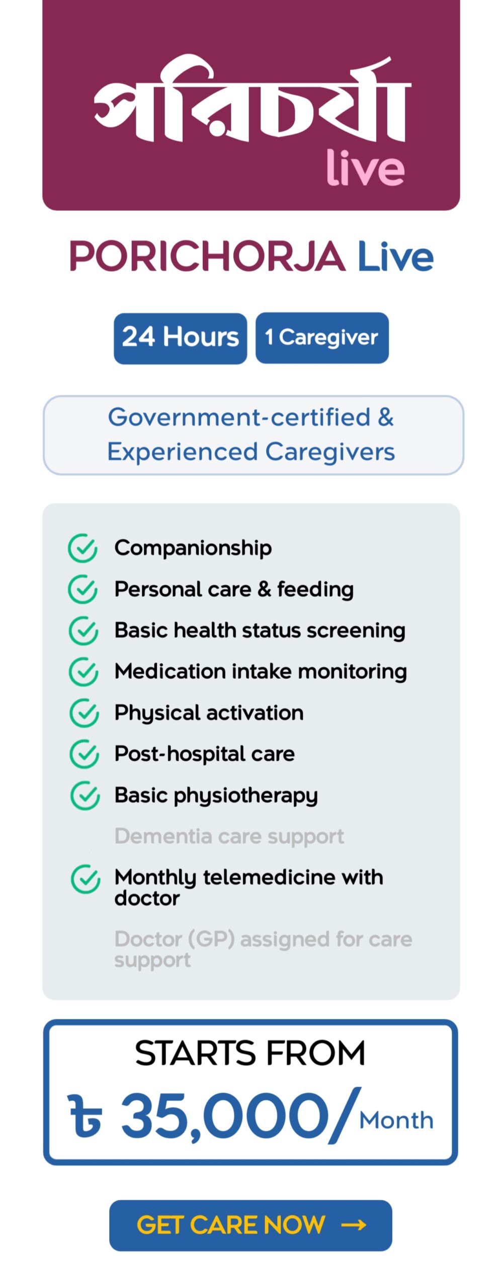 - Clients are required to provide at least one meal per day to the caregiver. If not provided, a meal allowance of BDT 3,000 per month will be charged. For 24-hour duties, providing meals is mandatory. ( ক্লায়েন্টদের প্রতি দিন অন্তত একটি খাবার প্রদান করা বাধ্যতামূলক। যদি খাবার প্রদান না করা হয়, তাহলে মাসিক ৩,০০০ টাকা খাবার ভাতা হিসেবে অতিরিক্ত চার্জ প্রযোজ্য হবে। ২৪ ঘণ্টার ডিউটির ক্ষেত্রে খাবার প্রদান অবশ্যই বাধ্যতামূলক। )